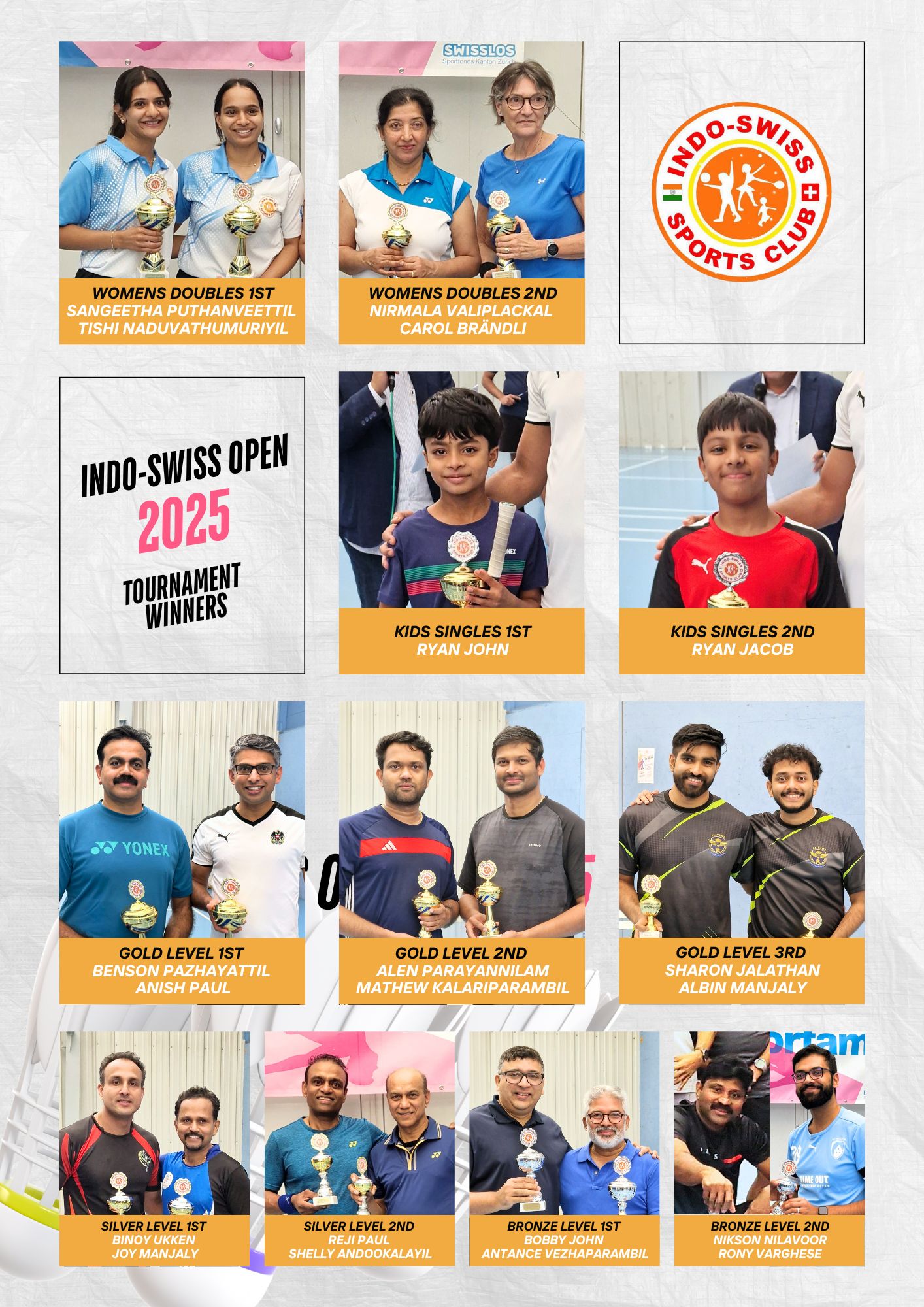 50+ Men’s Doubles1stShelly Andookalayil and Shaju Cheeramkuzhiyil